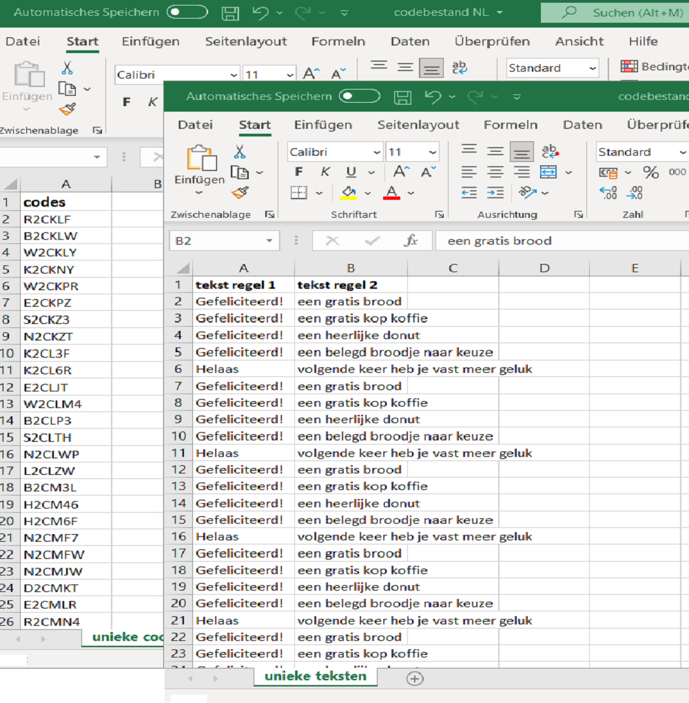 Wij nemen alle codes/teksten uit uw bestand over. De volgorde van de codes op het drukwerk is in principe niet gegarandeerd. Heeft u hier specifieke wensen over (bijv. vaste volgorde of koppeling aan batches), laat het ons dan vooraf weten.