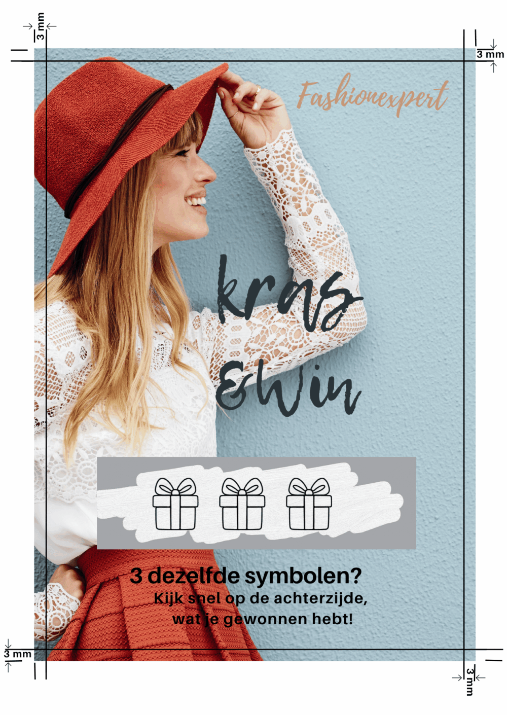 Bij een kraslaag geldt: het uitgespaarde vlak of de bedrukking die “onder” de kraslaag staat, moet rondom 2 mm kleiner zijn dan de kraslaag zelf. Zo blijft alles netjes binnen het krasvlak.